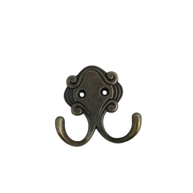 Gancho de pared doble de latón antiguo con un diseño decorativo.