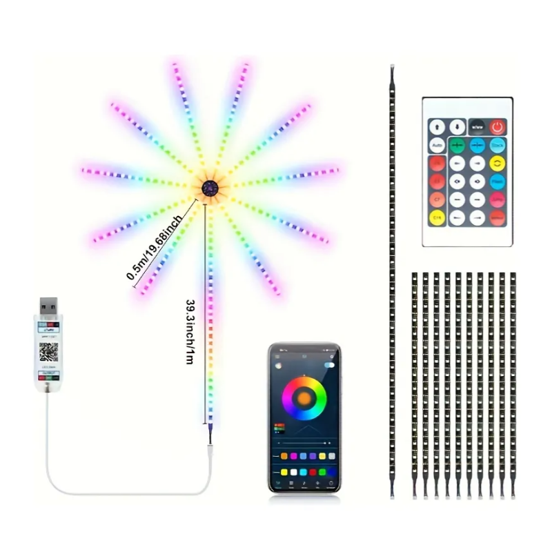 Luces LED tipo fuegos artificiales: tira de luces LED únicas con forma de fuegos artificiales con más de 213 modos dinámicos y 16 millones de cambios de color for la decoración del recámara. Luces LED de sincronización de música: controlado por la aplicación gratuita, cambia de color con sonidos circundantes y música for decoración de fiestas. Control de 3 vías: se puede controlar por control remoto, aplicación o driver de 3 botones for una fácil selección de color y atenuación. Fácil instalación: viene con tira adhesiva for un montaje limpio y seco. Amplia aplicación: perfecto for cuarto, recámara, sala de estar y decoración de Navidad en interiores con visualización de múltiples colores.